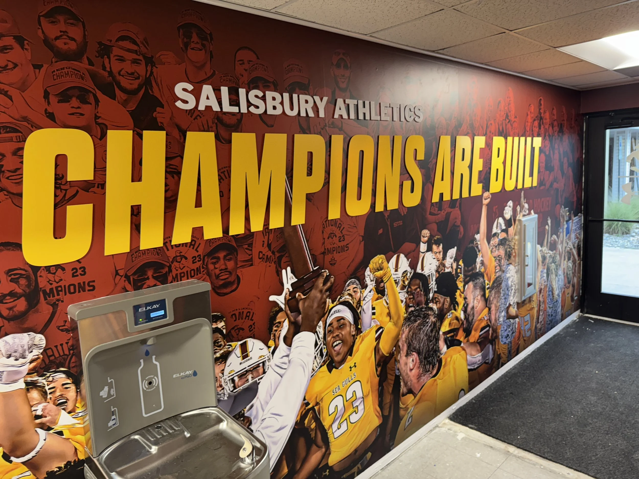 Inside the foyer, the story continues. A multi-surface mural highlights Salisbury’s championship tradition, centered around “Sammy” the Sea Gull layered over the state flag, city map, and university marks—tied together in bold scarlet and gold.